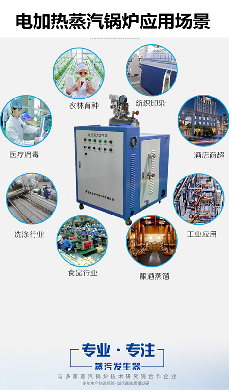4、具備齊全的多項保護功能,漏電保護、缺水保護、接地保護、蒸汽超壓保護、過流保護、電源保護等,鍋爐自動保護。