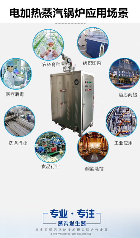 生產(chǎn)蒸汽的鍋爐稱為蒸汽電鍋爐,常簡稱為蒸汽爐,蒸汽熱源機(jī)。電熱蒸汽鍋爐(電加熱蒸汽發(fā)生器)就是指利用電源來加熱并且產(chǎn)生額定壓力的蒸汽鍋爐,是一種自動連續(xù)地產(chǎn)生較高壓力蒸汽的鍋爐,以電能為能源,無噪音。采用質(zhì)優(yōu)電加熱管,表面熱負(fù)荷低,熱效率高,方便安裝檢修。可為工業(yè),化工,食品,醫(yī)療,制藥,服裝,工程養(yǎng)護(hù)等多種行業(yè)快速提供必需的干燥蒸汽。