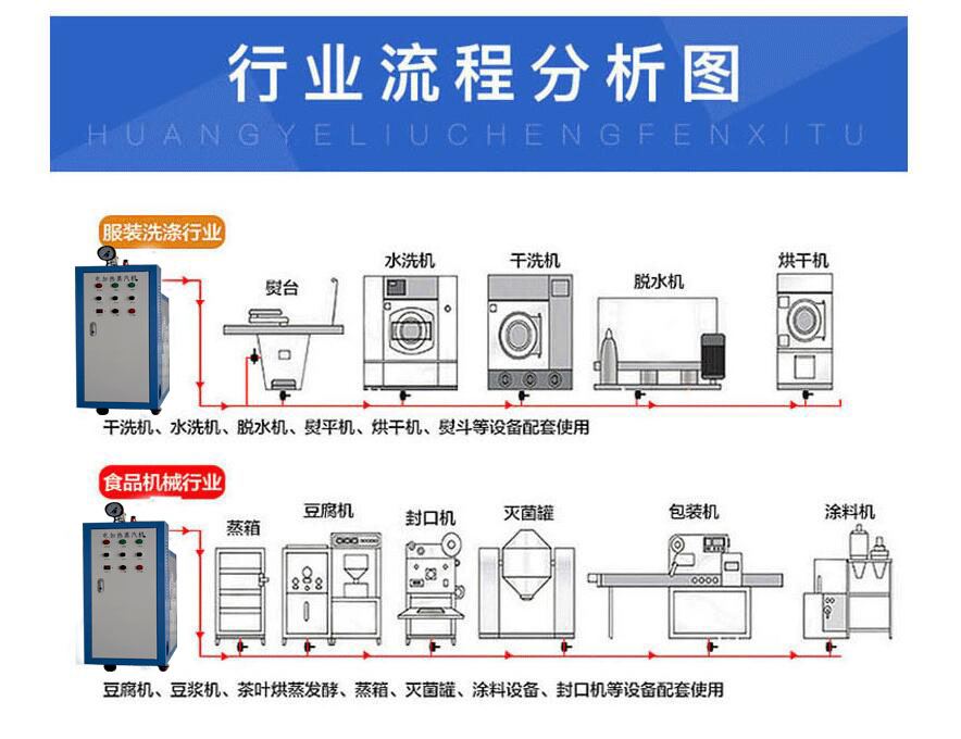 洗滌熨燙行業:干洗機、烘干機、水洗機、脫水機、熨平機、熨斗、等設備配套使用;
